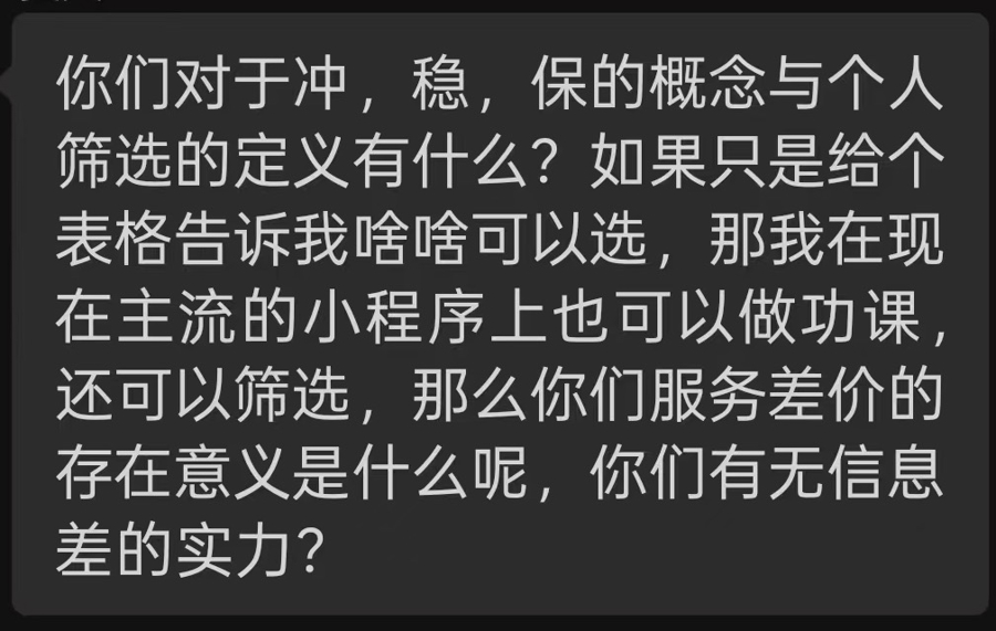 阿霞也有相似感受。他说,培训的核心并不是讲专业本身,而是教他们如何将学生的分数和位次输入系统,让软件自动生成院校范围,再将结果划分为“冲、稳、保”三个梯度。“很多专业我之前根本没接触过,短时间内也不可能真正搞清楚。”他说。
