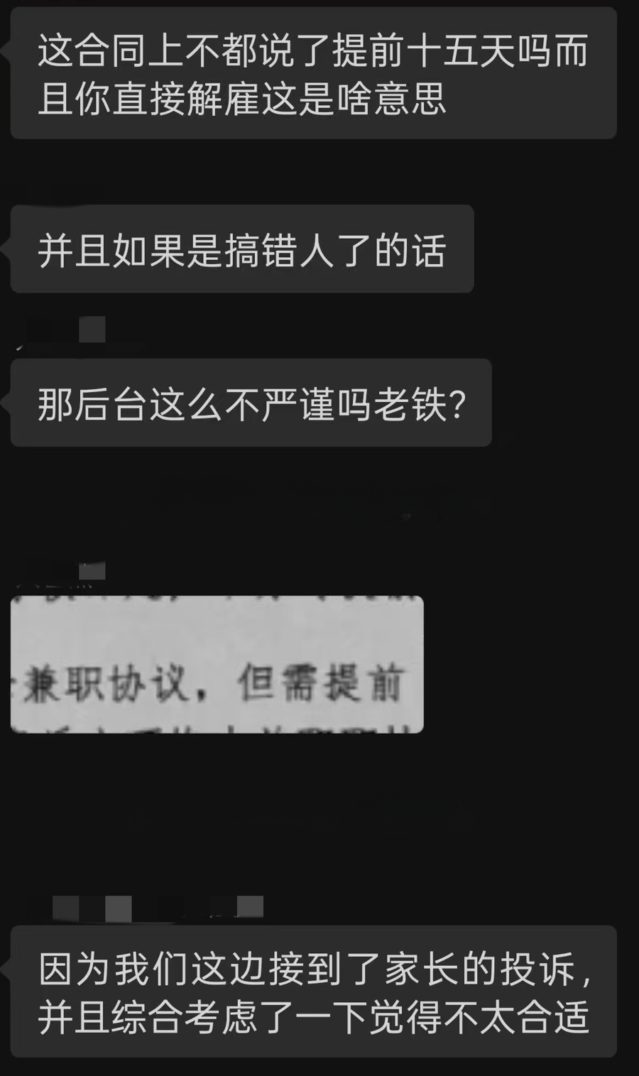 因为被家长投诉而提前终止合同的兼职大学生。