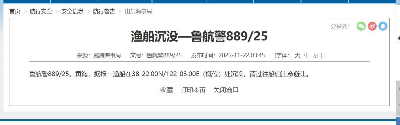 11月22日3时45分,中华人民共和国海事局网站发布信息称:黄海,据报一渔船在38-22.00N/122-03.00E(概位)处沉没,请过往船舶注意避让。11月23日,极目新闻记者从威海海事局获悉,涉事7人均已获救。